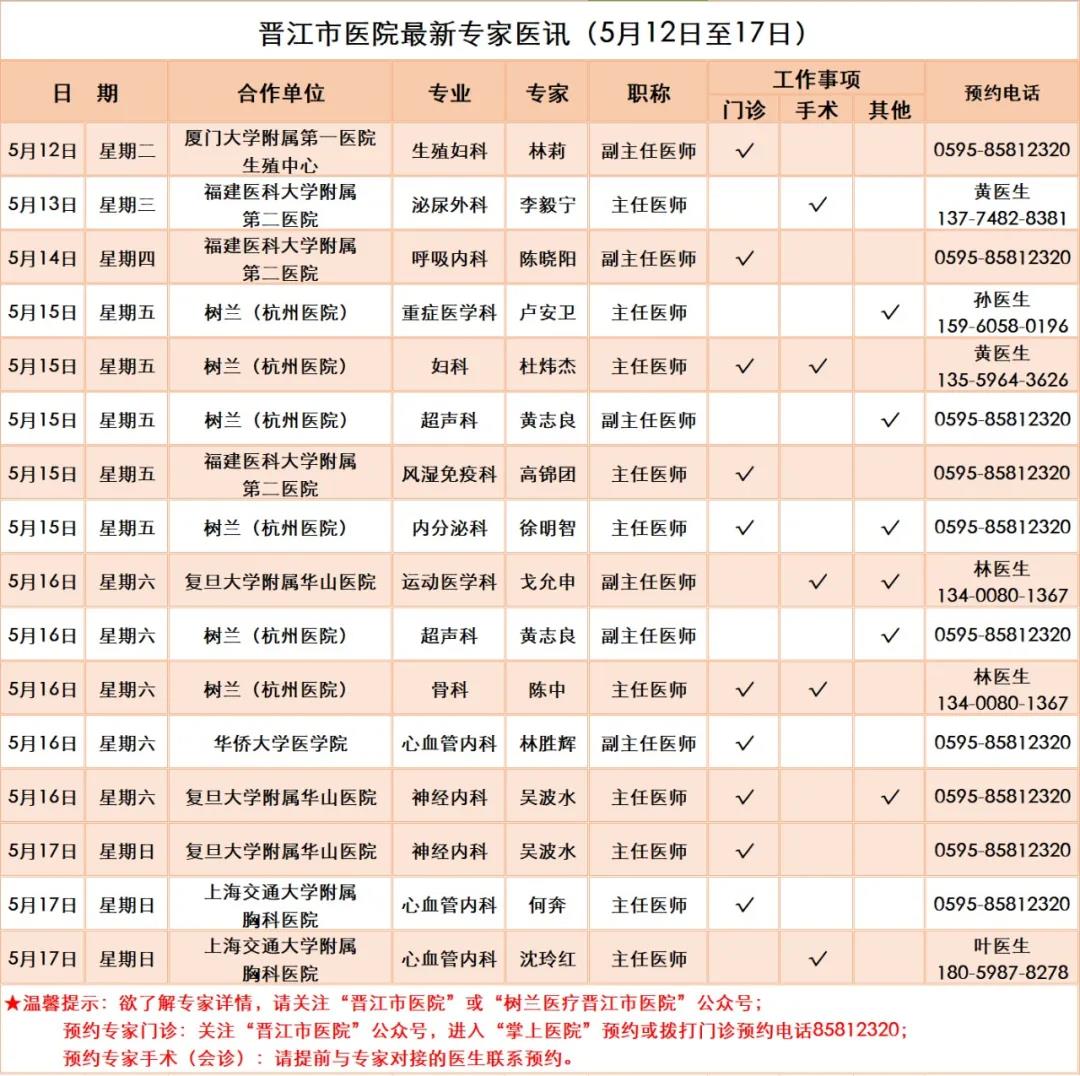 【每日更新】晋江市医院最新专家医讯(5月12日至17日)