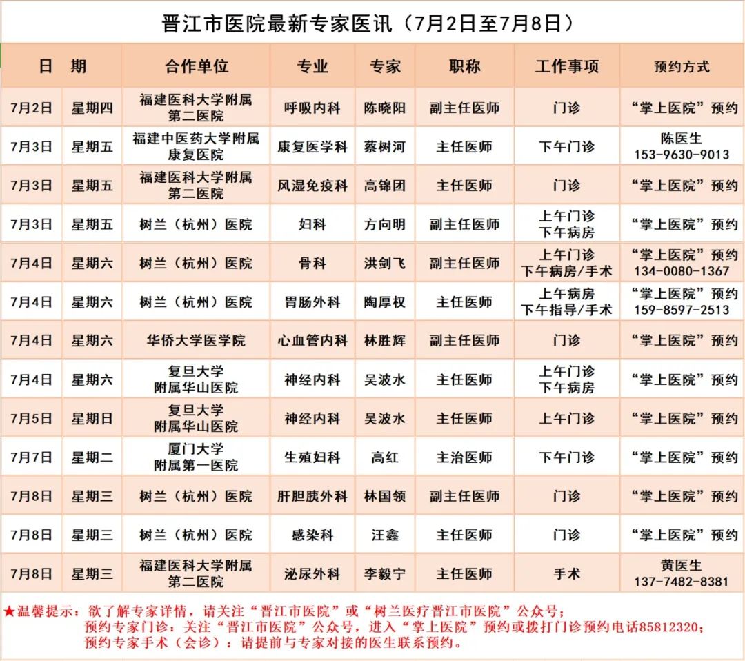 【每日更新】晋江市医院最新专家医讯(7月2日至7月8日)