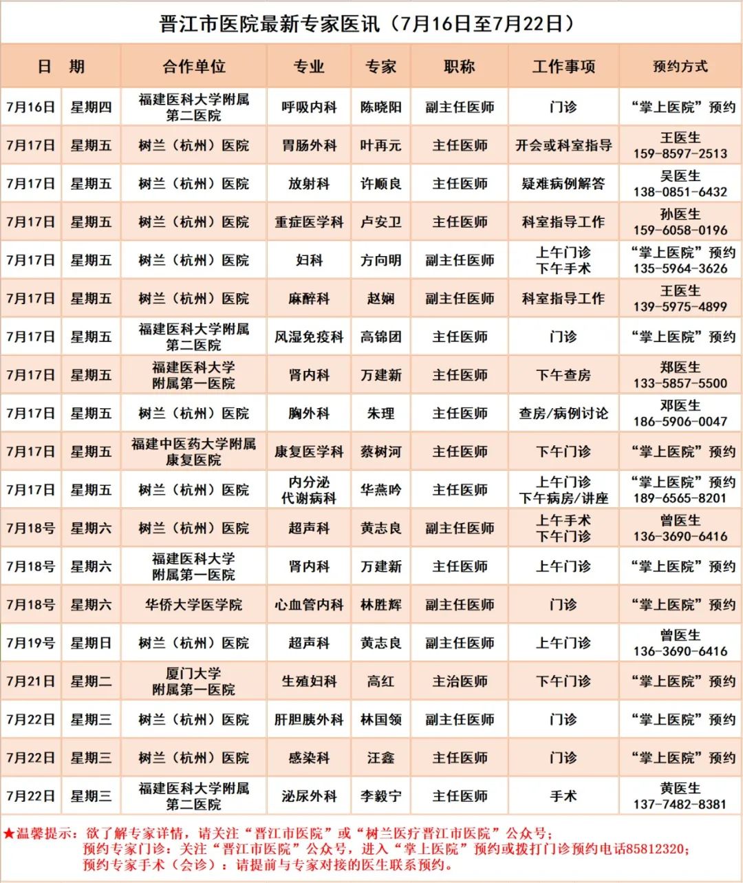 【每日更新】晋江市医院最新专家医讯(7月16日至7月22日)