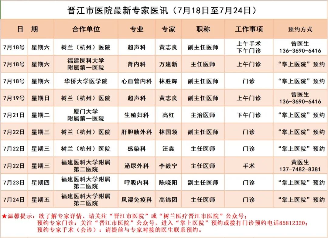 【每日更新】晋江市医院最新专家医讯(7月18日至7月24日)