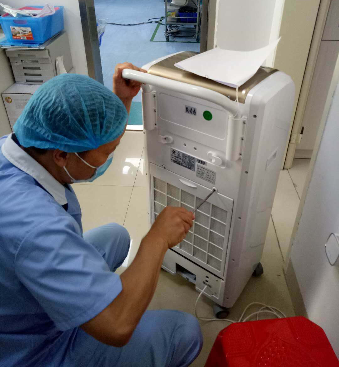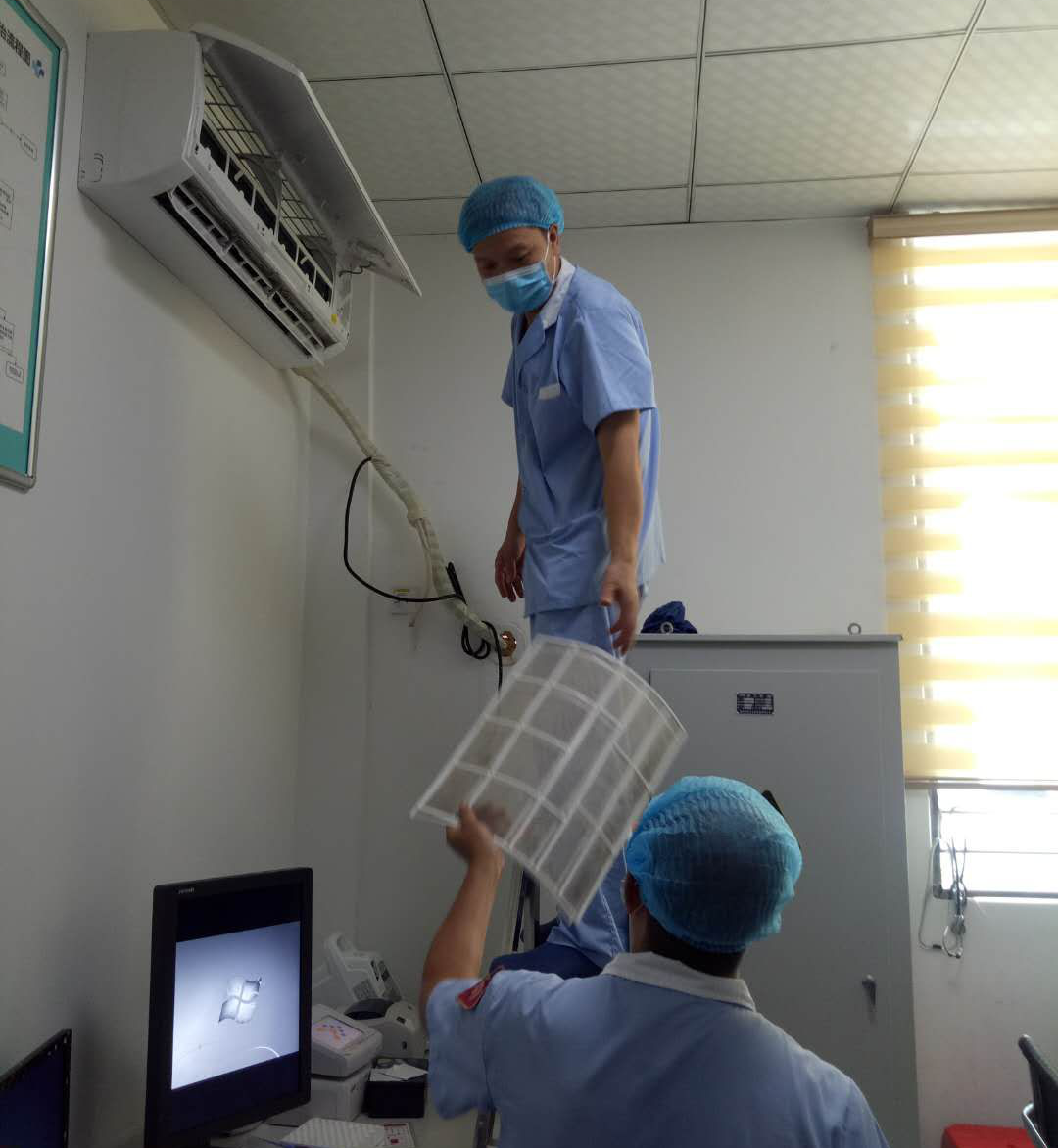 ♦ 对全院的空调进行了全面清洗消毒,对每一台空调做到拆开面板,过滤网、过滤器和冷凝水盘等部件清洗后采用喷雾结合擦拭的方法消毒,对于重要部件则视情况采用浸泡消毒法;