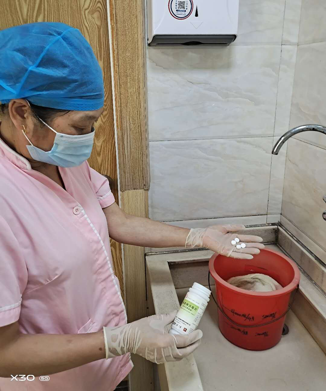 总务科及院感科持续加强对医院工勤人员培训与督查,包括工勤人员消毒液的使用、消毒程序流程、防护用品穿脱、院感防控知识等培训。
