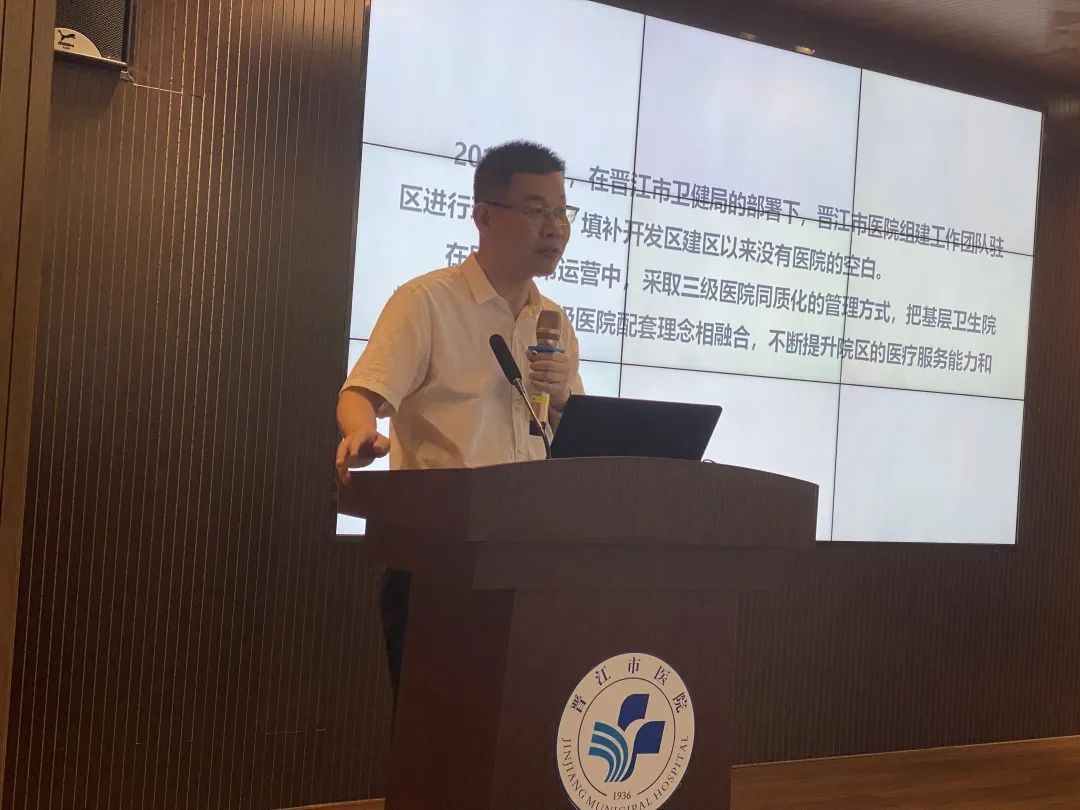▲ 晋江市医院党总支副书记、晋江市医院经济开发区院区主任林友榆作工作汇报