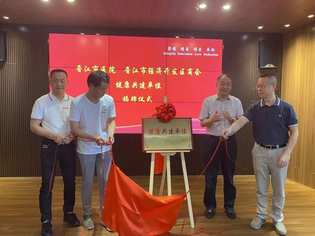 交流会上,晋江市与树兰医疗合作项目管委会主任、树兰(杭州)医院院长叶再元,晋江市卫健局局长纪刚宏,晋江经济开发区党工委书记谢永彬和经济开发区商会会长郑育焕共同为晋江市医院与经济开发区商会健康共建单位揭牌。同时,现场还举行健康体检卡捐赠仪式。