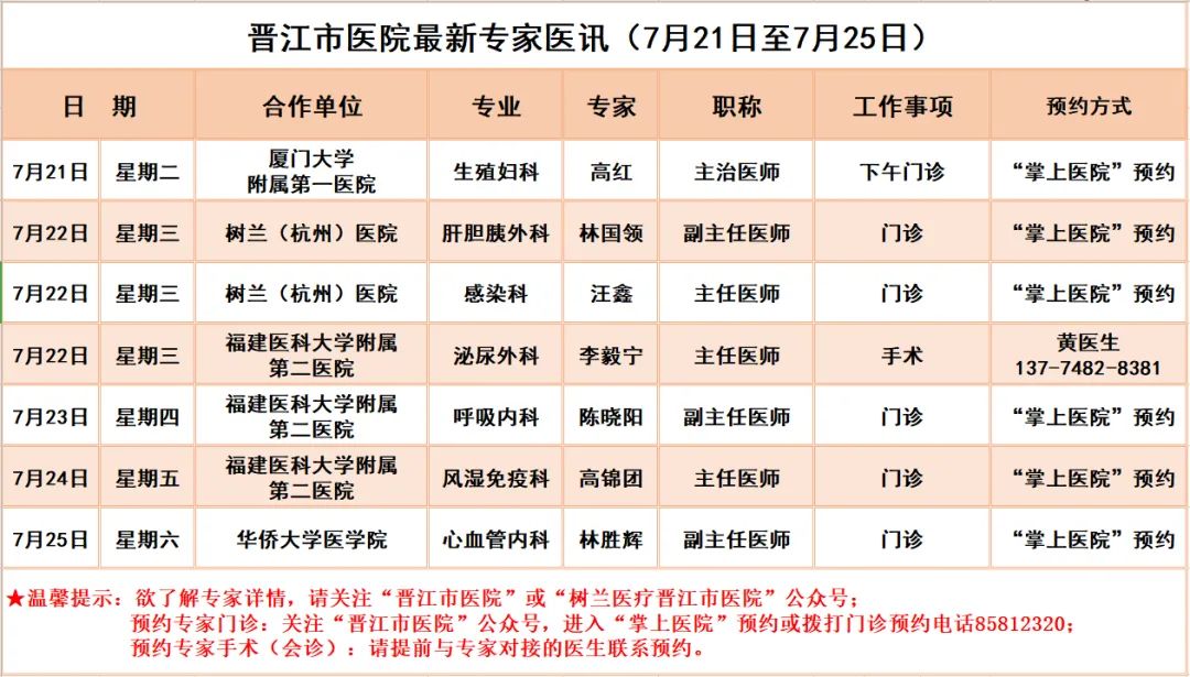 【每日更新】晋江市医院最新专家医讯(7月21日至7月25日)