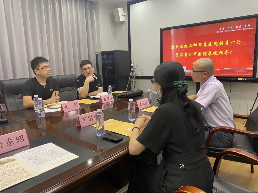 7月22日下午,石狮市总医院党委副书记、总医院院长孙飞轮,石狮市总医院副院长蔡建通一行十余人到我院进行交流座谈,借鉴相关“国字号”胸痛中心创建经验。晋江市医院院长陈铭、党总支书记黄东昭出席座谈会,胸痛中心相关临床及职能科室负责人参加会议。