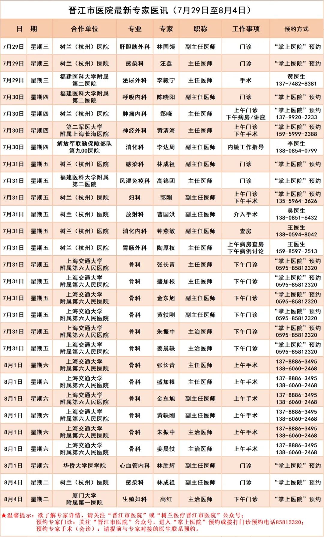 【每日更新】晋江市医院最新专家医讯(7月29日至8月4日)