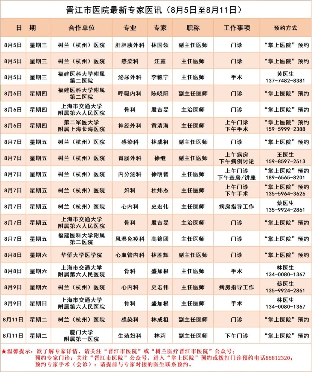【每日更新】晋江市医院最新专家医讯(8月5日至8月11日)