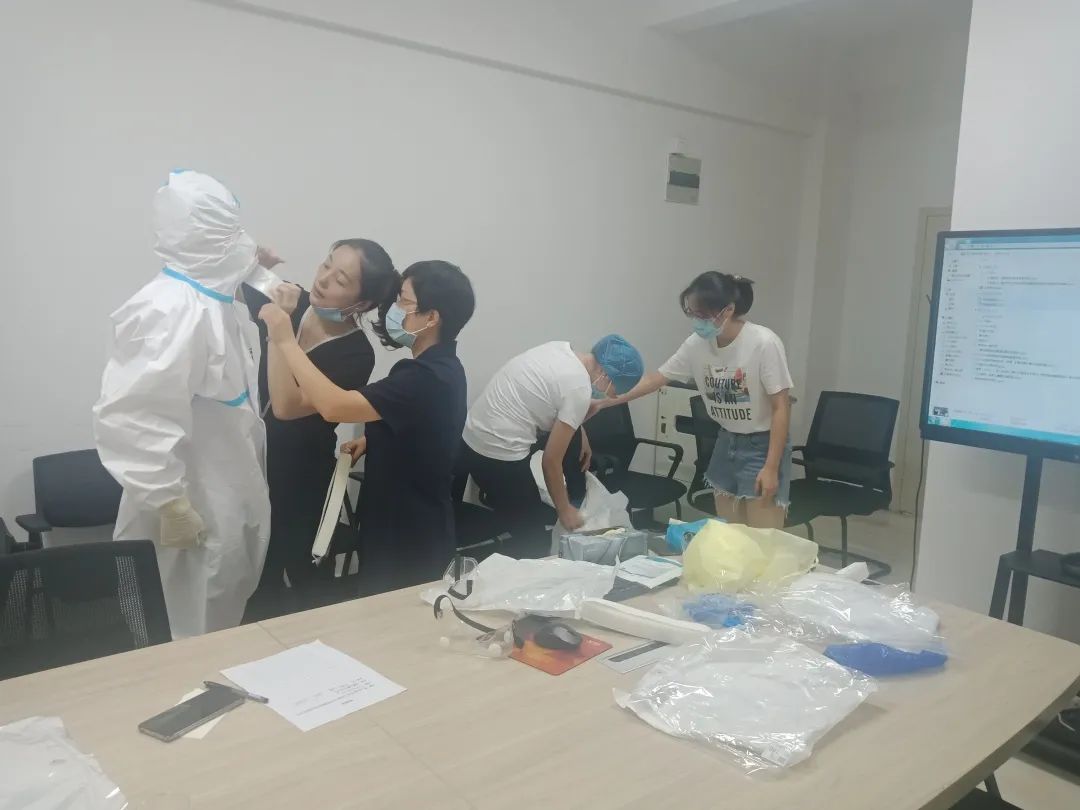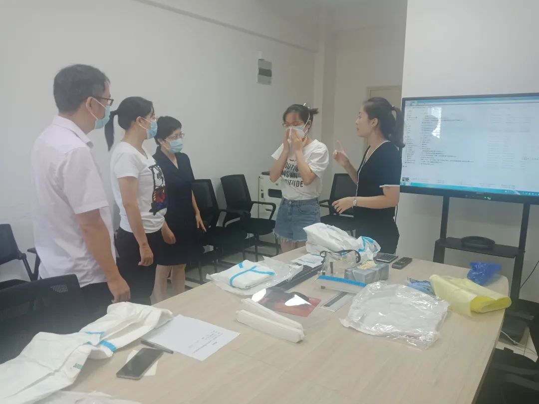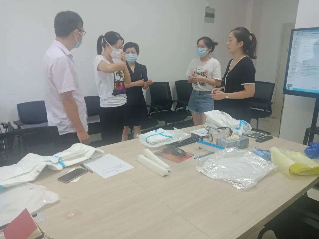 院感科张华清副科长针对新冠肺炎的院感知识,进行实际操作训练。根据医疗队员所在的科室进行实景分析,找出防控关键点并逐一强化落实,特别是对穿戴防护用品、进出高危工作区、污染区进行全流程指导,确保队员考核达标。