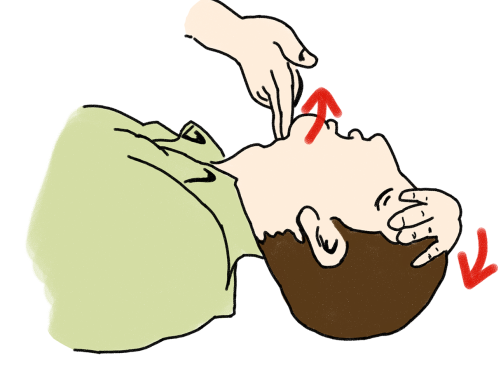 一手置于溺水者前额使其头部后仰,另一手食指与中指置于下颌角处,抬起下颌以开放气道。