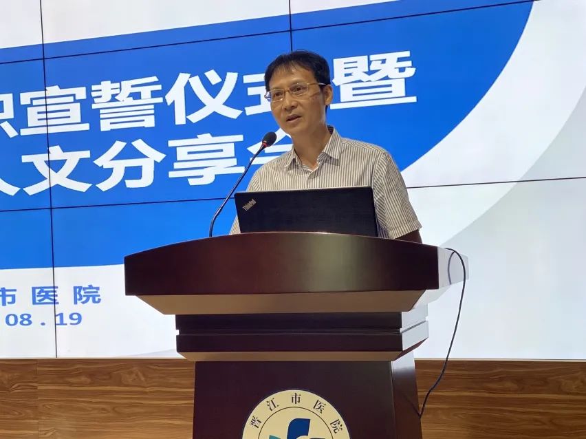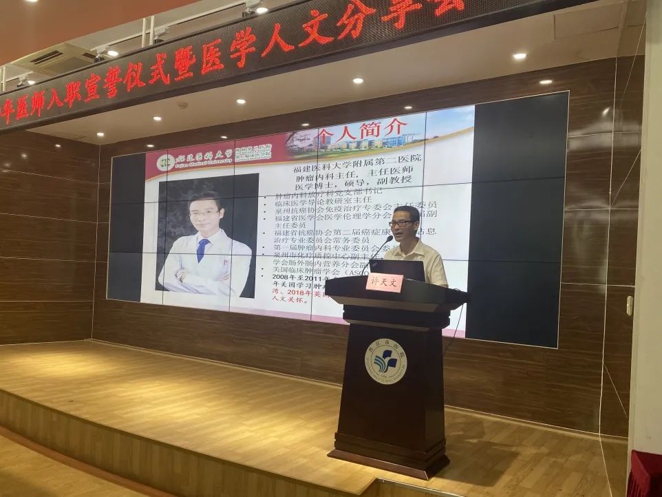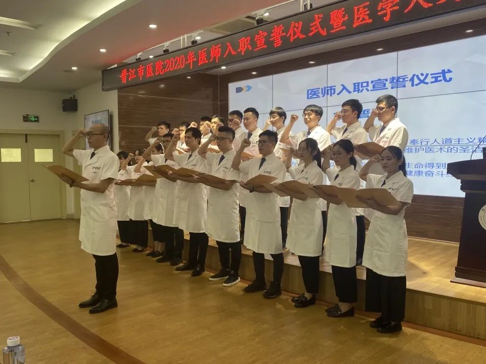 为展示新时代医务工作者奋发向上的精神风貌,推进医院文化建设,树立良好的行业形象,8月19日下午,晋江市医院于二号楼12楼会议室举行“守本心、记使命”医师入职宣誓仪式暨医学人文分享会,通过举办青年医师宣誓,邀请医学人文专家对青年医师进行精神培育,旨在唤起医学的理性知觉——尊重生命和敬畏生命。