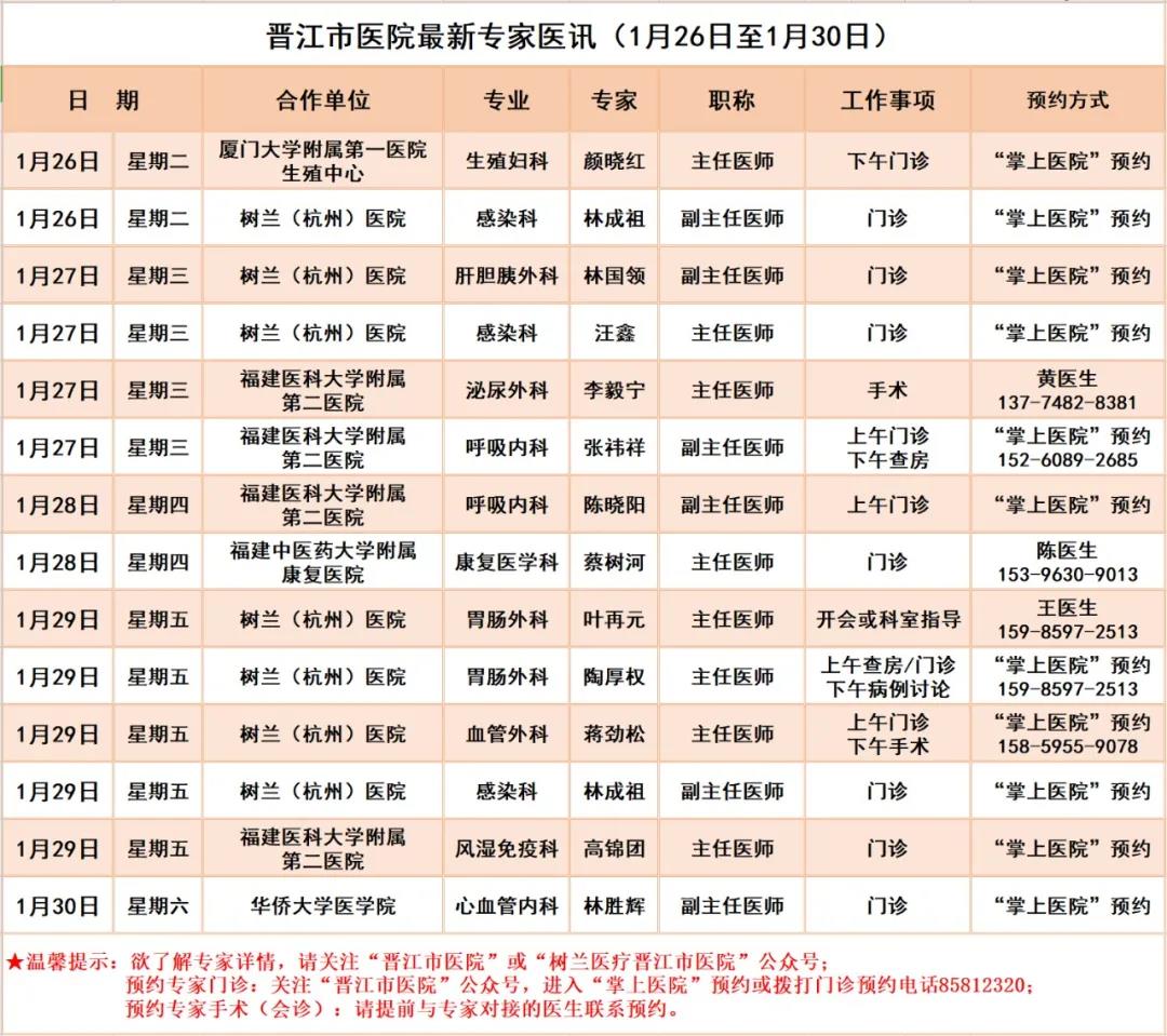 【每日更新】晋江市医院最新专家医讯(1月26日至1月30日)