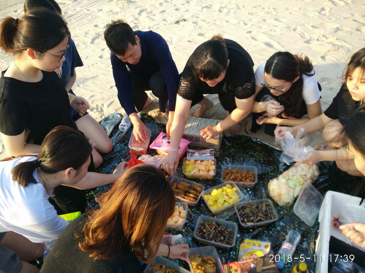 五小分队陆陆续续到达目的,扛饮料大包小包的小吃水果对于经常干活的护士小姐姐们来说都不是事儿。选一块海滩,铺上野餐布,摆上心灵手巧的小姐姐们自己做的醋肉、钉螺、鸡